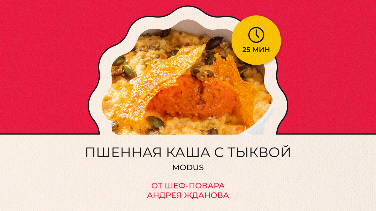 Перед подачей в ресторане Modus пшенная каша выкладывается в глубокую миску, поливается кремом англез, сверху выкладываются кусочки запеченной тыквы. Украшается блюдо кусочком сливочного масла, тыквенными семечками и каплями тыквенного масла. Непременно порадуйте себя этим завтраком! Приятного аппетита!