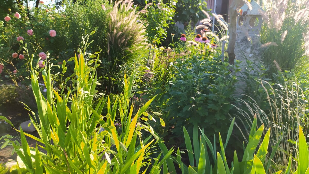 Хочу сразу сказать, что не все эти снимки демонстрируют разные места. Некоторые показывают один и тот же фрагмент цветника с разных сторон. Я, как бабочка, кружусь над выбранной локацией, потому что, что ни ракурс - то целая картина. С этой точки - лилейник в сочетании с седумом, с другой - он же с лилией и геранями, с третьей - лилия с розой и тысячелистником. А чуть отойдешь назад - и уже все это можно просматривать сквозь натянутые, звонкие струны злаков. А уж как утренний или предзакатный свет любит играть в этих зарослях!.. Это же целая песня, ЭТО НАСТОЯЩЕЕ ИСКУССТВО! Его невозможно оставить без внимания. Хочу, чтобы и вы смогли погрузиться в эту волшебную игру света и теней.