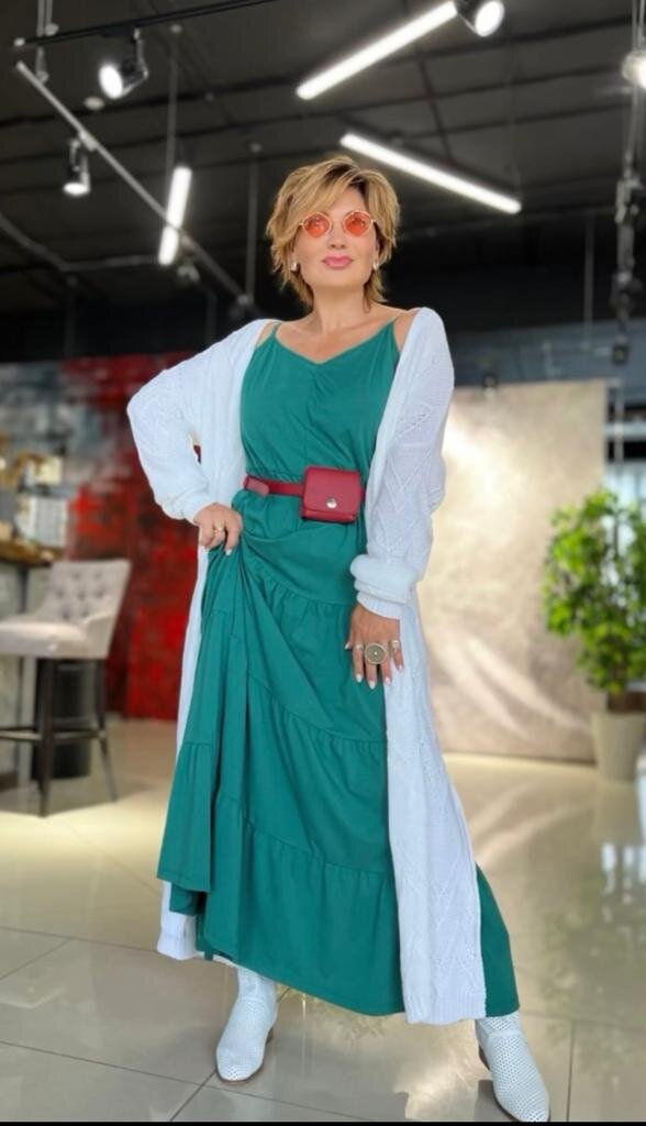 На фото ниже модное платье в зеленом цвете с длинным кардиганом.