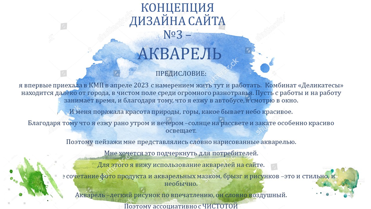 сейчас я доделываю разработки сайта для комбината. Ранее сайт их вообще не обновлялся с 2016г. я сейчас своими силами немного обновила существующий. и вела разработки нового сайта современного. по уходу с работы-хочу сдать все разработки. Вряд ли чем то воспользуются. поэтому хоть тут похвастаюсь ВАРИАНТ №1 - любимый! акварель примут это вариант шансов почти нет. А идея мне очень нравится. сочетание фото продукта и акварели . сделала несколько эскизов. (я не дизайнер, это не дизайн готовый. это эскизы как умею) ВАРИАНТ №2 - КЛАССИКА ОБЫЧНЫЙ С ПРИМЕННЕНИЕМ ФИРМЕННЫХ ПАТТЕРНОВ ВАРИАНТ №3 СОВРЕМЕННЫЙ, СТИЛЬНЫЙ, МОДНЫЙ (И ВТОЖЕ ВРЕМЯ С ПАТТЕРНОМ ФИРМЕННЫМ. НУ ПОСЛЕДНИЙ ВАРИАНТ ТОЧНО ВРЯД ЛИ ПРИМУТ)) ну а я лишний раз убедилась что я крутой профи, даже в 48 мозг работает как молодой