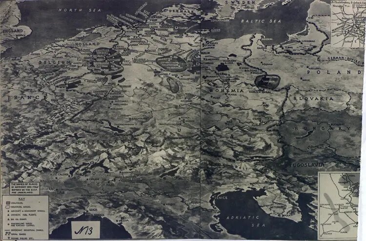 Карта показывает, что сообщения о серьезных разрушениях, причиненных в больших размерах германской промышленности английской авиацией, имеют веские основания. Карта показывает, также, что не менее веские основания имеют слухи, сопровождающие эти сообщения о том, что большие районы, где проживает гражданское население, пощажены английской авиацией; о том, что происходит массовая эвакуация гражданского населения из Рейнской области и о том, что голландцы каждую ночь наблюдают зарево больших пожаров на востоке. На карте подчеркнуты названия городов, подвергшихся бомбардировкам, и видно, что такие названия густо расположены в западной Германии.