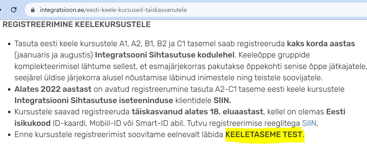 1. Честно протестируйте себя на сайте Eesti keele Maja - адрес на скриншоте (прилагаемом к посту изображении, с ярко-жёлтым текстом - пройдя по ссылке надо будет нажать на это слово (оно там не будет жёлтым, это я его выделила, так как там криворукие программисты забыли подсветить синим гиперссылку). Тест длинный и на время. В конце тест вам скажет, какого уровня курс вам подходит. Будьте готовы к тому, что результат вам не очень понравится. Но сделайте себе скриншот результата (или запишите), чтобы не забыть.