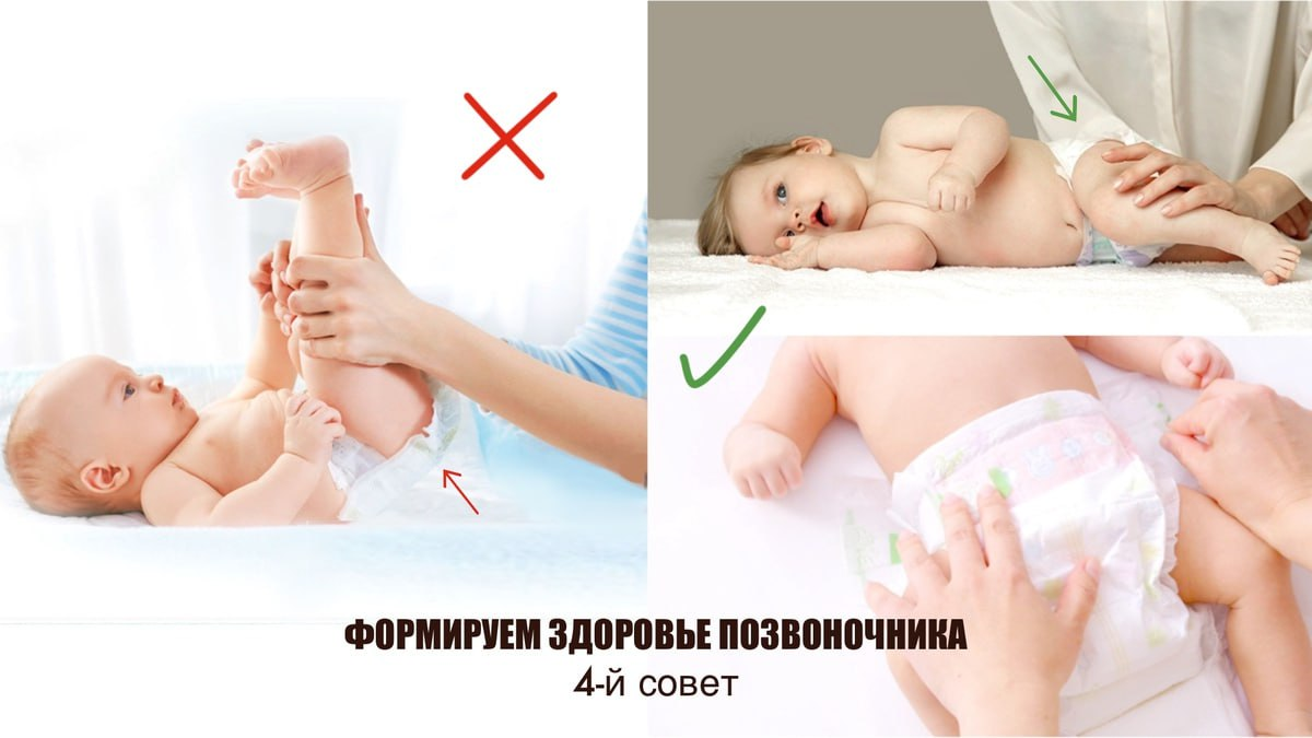 При смене памперсов, других манипуляциях, когда необходимо поднять нижние конечности ребенка, не стоит поднимать их так, чтобы поясница отрывалась от поверхности кровати более, чем на ширину кулака ребенка.