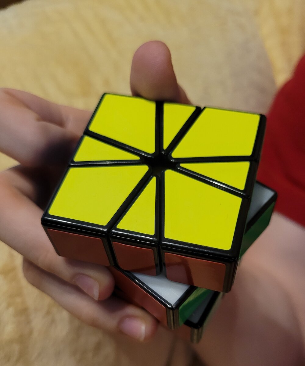 Привет. В сегодняшнем посте я опять хочу рассказать про головоломку. Про кубик Рубика я уже рассказывала, поэтому сегодня расскажу про сквайр-1. Сквайр – это одна из двух WCA дисциплин, которые имеют не такой принцип сборки, как у 3х3. Он имеет совершенно другие обозначения и алгоритмы сборки. Вот пример скрамбла для скваера: (0,-3) / (0,3) / (-3,6) / (0,-3) / (3,-3) / (5,1) / (0,2) / (4,-2). Что есть что? Сейчас объясню: числа в скобках обозначают повороты верхнего или нижнего слоя (кроме них и слайса всё рано больше никак не крутится) по часовой или против часовой стрелке. Как понять насколько вращать? У скваера рёбра равны 1, а углы – 2. Если посмотришь на скваер, то сразу станет понятно. Итак, число положительное – вращаем по часовой, число отрицательное – против. С этим разобрались, поехали дальше. Косая черта после скобок обозначает слайс. Слайс движение, которое проходит через всю головоломку по диагонали (скваер разделен чертой по диагонали). Особенность скваера и шейпмодов в т