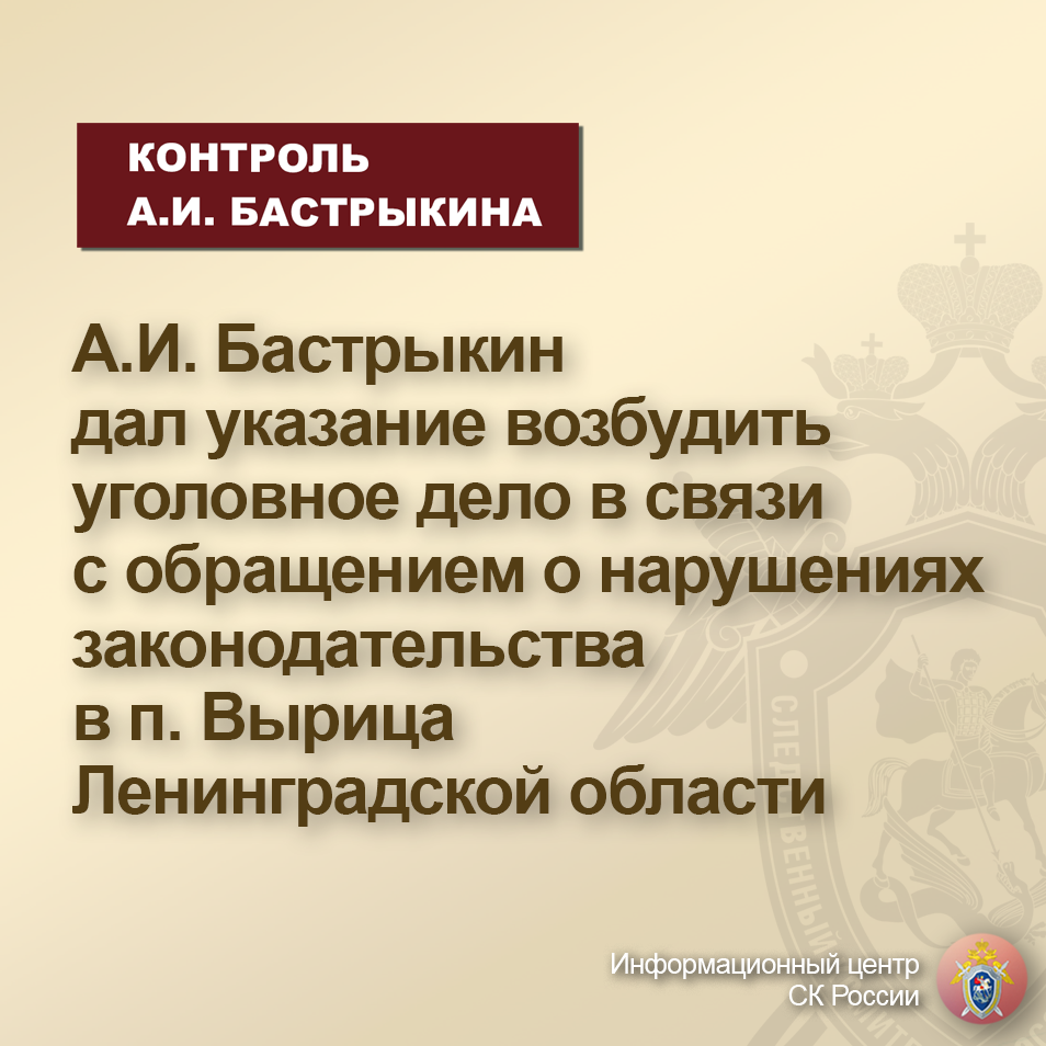 А.И. Бастрыкин дал указание возбудить уголовное дело в связи с обращением о нарушениях законодательства в п. Вырица Ленинградской области