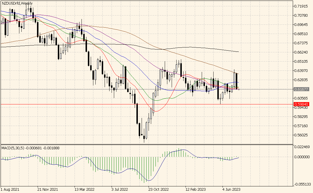 На 24 июля создались условия для открытия короткой позиции по новозеландскому доллару. Недельный таймфрейм показывает, что цена оказалась ниже самой быстрой МА13. Был предварительный разворот цены от МА89 (коричневая). Цель движения - 0.5984 - low мая. На графике Н8 цена ушла под последнюю и старшую скользящую среднюю с периодом 144 чёрного цвета. MACD набирает скорость снижения. Таймфрейм Н4 показывает устойчивый нисходящий тренд по мувингам и MACD. Н1 также показывает падение цены по всеми скользящими средними, осциллятор имеет возможность образовать третье дно. Рекомендуемый брокер - Альфа-Форекс