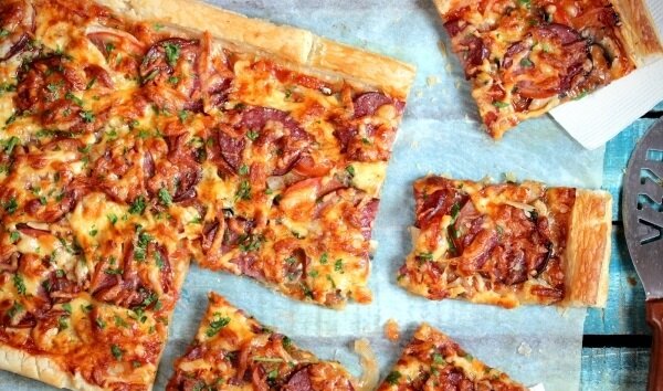 Рецепт пиццы из слоёного теста с колбаской. Естественно, что для традиционной пиццы тесто желательно бы готовить своими руками, настоящее дрожжевое тесто, как следует подошедшее и с выдержанными пропорциями ингредиентов. Но когда нет времени на приготовление теста, на выручку спешит уже готовое слоёное тесто. Вот поэтому-то и удобно всегда иметь такое тесто в морозилке - достал и пользуйся на здоровье;) И пицца получается вкусной, и никому не нужно ждать, в итоге все сыты и довольны Ингредиенты: Тесто слоёное - 500 г Колбаса - 200 г Шампиньоны - 200 г Репчатый лук - 0,5 шт. Твёрдый сыр - 150 г Помидоры - 2 шт. Кетчуп - 5 ст.л. Итальянские сухие травы - 0,5 ч.л. Соль - по вкусу Чёрный молотый перец - по вкусу Процесс приготовления Чтобы приготовить пиццу из слоёного теста, возьмите слоёное дрожжевое или бездрожжевое тесто, томатный соус или кетчуп, репчатый лук, шампиньоны, колбасу, помидоры, твёрдый сыр, итальянские сухие травы, соль и молотый перец. Слоёное тесто разверните прямоугол