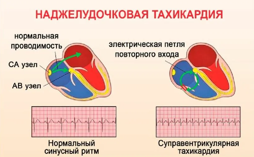 Тахикардия – это вид аритмии, характеризующийся повышенной частотой ритма сердца. Почему ее называют суправентрикулярной? Второе название этого термина «наджелудочковая». Собственно, отсюда ноги и растут. Эта аритмия берет свое начало в предсердиях – зоне, располагающейся выше желудочков сердца. По-английски, ventricle – это желудочек, а supra – «над». Ну а дальше дело логики. Суправентрикулярная тахикардия (СТ) проявляется приступами сердцебиения с частотой сердечных сокращений 140–220 и более уд/мин. Развивается она под влиянием импульсов из предсердий или атриовентрикулярного узла.