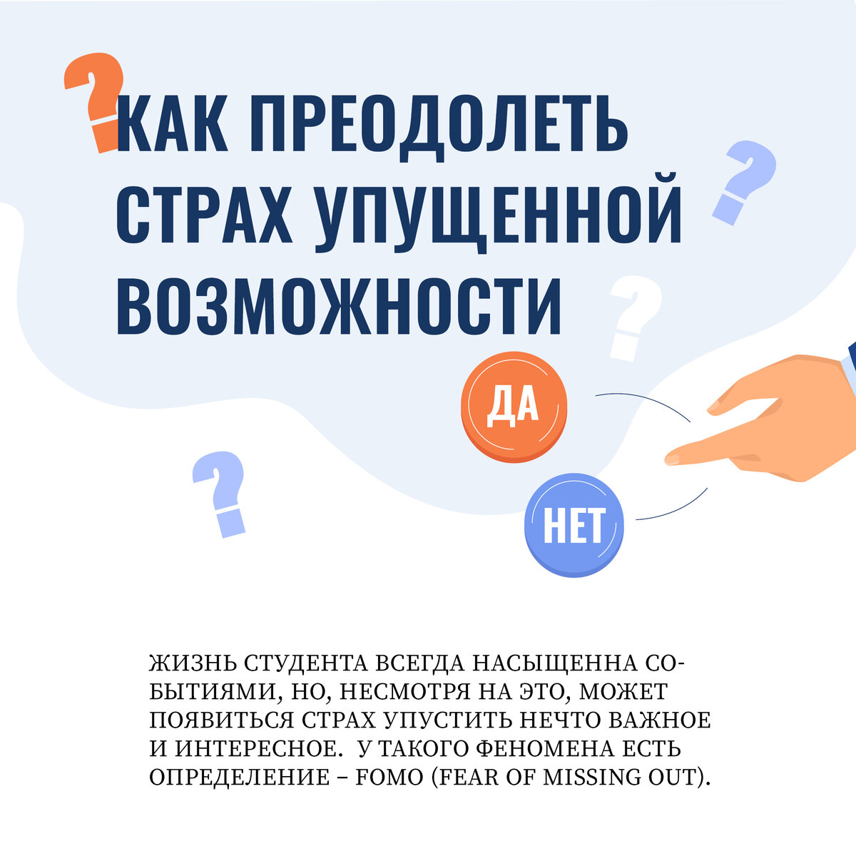 Жизнь студента всегда насыщенна событиями, но, несмотря на это, может появиться страх упустить нечто важное и интересное. У такого феномена есть определение – fomo (fear of missing out).
