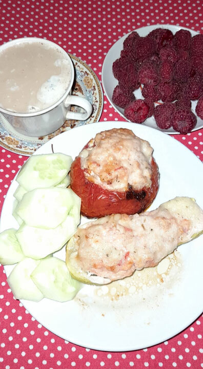 Эти блюда можно и на завтрак, и на ужин. В холодильнике нашлись кабачки и помидоры, фарш куриный, лук, маленький кусочек сыра и ложка сметаны. У помидоров срезать верхнюю часть, вынуть ложечкой внутренности. Выложить в форму. Кабачки молоденькие разрезать вдоль и ложечкой удалить семечки. Выложить в форму. Все, что удалили у помидоров и кабачков, выложить в блендер. Добавить нарезанный лук, перемолоть. Смешать с фаршем, посолить, добавить специи (у меня уцхо сунели). Заполнить помидоры и половинки кабачков. Поставить в разогретую духовку на 30 минут при 200°. В это время натереть сыр и смешать со сметаной. Через 30 минут достать форму, выложить сырную массу на помидоры и кабачки, поставить ещё на 20 минут в духовку. Если позволяет форма, то можно все приготовить в одной, у меня не поместилось. Помидоры дают очень много сока, я их после духовки ставила на огонь и слегка выпаривала. Можно добавить зелень. Всем приятного аппетита! + 2 фото От наших друзей: Александр Вулых, поэт, автор тек