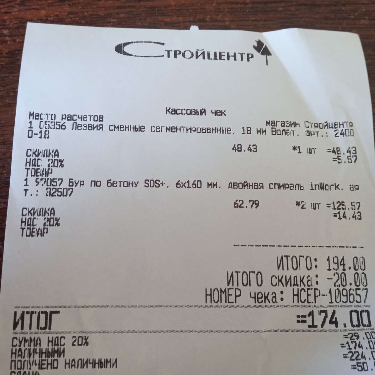 Своим заказчикам, я предоставил чек на два сверла и сменные лезвия. Они были очень возмущены. Почему они должны оплачивать мою покупку? Стал объяснять, что сверла и лезвия являются расходным материалом. Это не инструмент, который я заберу обратно.
