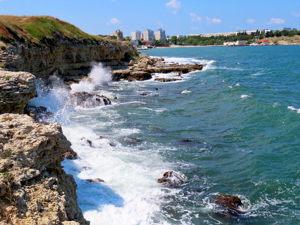 Вот так бьют и бьют волны о берега, медленно их подмывая. А ведь и часть Херсонеса уже под водой. Можно только представить, как волны медленно наступают на берега, скрывая под собой и причалы, и крепостные стены и дома. Но происходит это очень и очень медленно. Дальше есть еще крепостные стены, но уже не хочется идти к ним. Поворачиваю на тропу среди некошеного поля. Косарь пока еще не успел до нее добраться. Как колышутся травы на ветру! Волны в море переходят в волны трав на обрыве. Очаровывает! На небе появляются облака. Как же красиво! Синее небо с облаками и скошенные просторы травы! Как будто я и не в Херсонесе! Хочется найти тенек и прохладу. Направляюсь просто в сторону скопления современных зданий. Здесь, по всей видимости, управление. Но какой тихий и прохладный двор! Фонтан! Тисовая и туевая аллеи! И главное скамейки, скамейки и скамейки. Народ уже начал заполнять территорию. Бродит по руинам. Начались экскурсии. И тут я вспоминаю, что еще остался амфитеатр! В нег