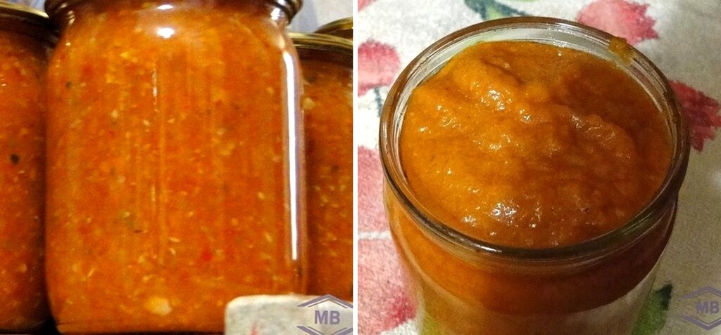 Икра из кабачков с томатной пастой и аджика вкусны, как самостоятельное блюдо, так и подходят как соус для мясных блюд и добавкой в супы.