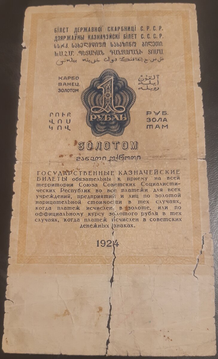 До первой мировой войны денежные единицы всех стран были привязаны к драгоценным металлам (серебро и золото) в определённых пропорциях веса. С 1919 г. расчетные знаки РСФСР (о них я расскажу в одной из следующих статей) стали обеспечиваться «всем достоянием государства» без какой-либо конкретики. Т.к., по сути, никакого обеспечения драгметаллами не было, зарубежные государства не принимали расчёт в сов знаках. В самом РСФСР деньги так же быстро теряли цену и реальную стоимость, в стране была гиперинфляция. В 1922г. в основном для расчётов с иностранными государствами в РСФСР появилась новая денежная единица – Червонец (о нем я так же расскажу в одной из следующих статей). «Червонец» выпускал государственный банк СССР, и он «содержал» в себе 1 золотник 78,24 доли чистого золота (7,74 грамма). Параллельно с банковскими билетами, были выпущены золотые монеты 900 пробы, которые по своим весовым и габаритным характеристикам полностью повторяли монету дореволюционной России в 10 рублей. Согласно декрету ЦИК и СНК СССР от 5 февраля 1924г. в СССР были выпущены государственные казначейские билеты нового образца. Номинал новых банкнот был «1 рубль золотом» (выпускались банкноты номиналом 1,3 и 5 рублей). Банкноты выпускались Главным управлением производства государственных знаков - сокращенно "Гознак". На банкнотах была надпись «Государственные казначейские билеты обязательны к приему на всей территории Союза Советских Социалистических Республик во все платежи, для всех учреждений, предприятий и лиц по золотой нарицательной стоимости в тех случаях, когда платеж исчислен в золоте, или по официальному курсу золотого рубля в тех случаях, когда платеж исчислен в советских денежных знаках». Курс государственных казначейских билетов образца 1924г. к Червонцу был установлен 1:10 (т.е. за 1 червонец давали 10 «золотых» рублей. Исходя из этого, можно посчитать что 1 «золотой» рубль содержал (не официально) 0,774 грамма золота (сегодняшнюю его идентичную стоимость можно посчитать исходя из стоимости золота на официальной бирже). Обмен государственных казначейских билетов образца 1923г. на государственные казначейские билеты образца 1924г. проводился исходя из 1:50000 (за 50 000 рублей 1923г. давали 1 «золотой» рубль образца 1924г.). На ровне с банкнотой в обращении была серебряная монет массой 20 грамм серебра 900 пробы.