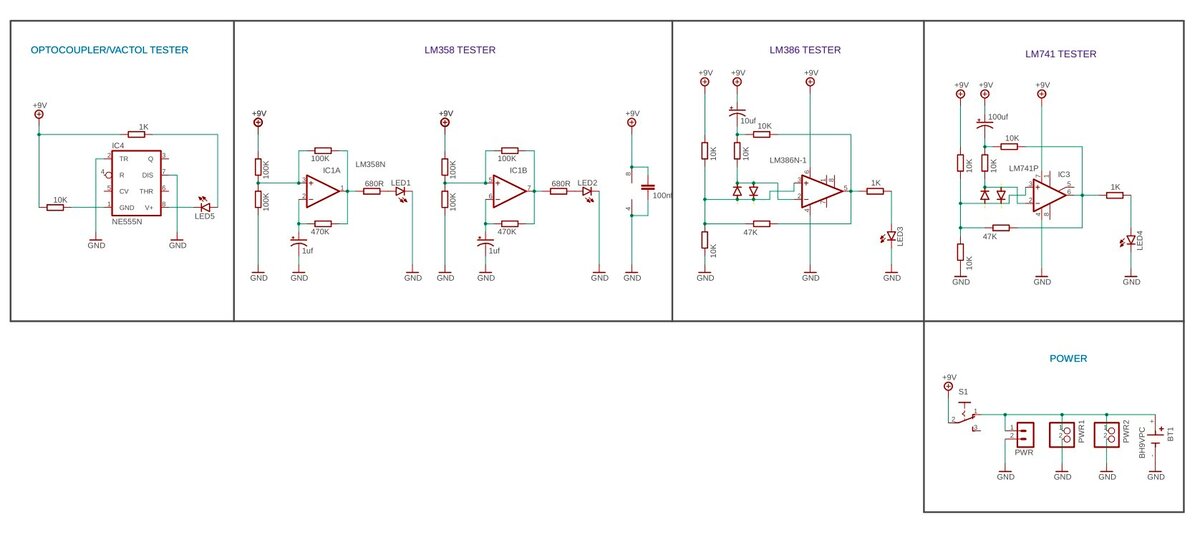 Добрый день дорогие друзья. Многие радиолюбители в том числе и я, постоянно сталкиваются с тем собранная нами конструкция не работает, или не выдает нужных параметров. И очень часто причиной этого бывают бракованные, фальсифицированные и перемаркированные электронные компоненты поставляемые нам недобросовестными продавцами с Aliexpress. Об этом я писал на моем канале. в статье: Поддельные радиодетали. Как радиолюбителю распознать и отличить от оригинальных. Недавно мне на одном из зарубежных сайтов попалось описание тестера для проверки операционных усилителей, и кроме операционных усилителей он еще проверяет и УНЧ LM386 и оптопары. Сегодня мы с Вами подробно рассмотрим конструкцию этого тестера. Вот его схема. Принцип работы тестера операционных усилителей заключается в использовании компараторов напряжения внутри операционного усилителя. Они имеют инвертирующий (-) и неинвертирующий (+) вход и выход. Они подключены таким образом, чтобы на выходе генерировался прямоугольный сигнал, к