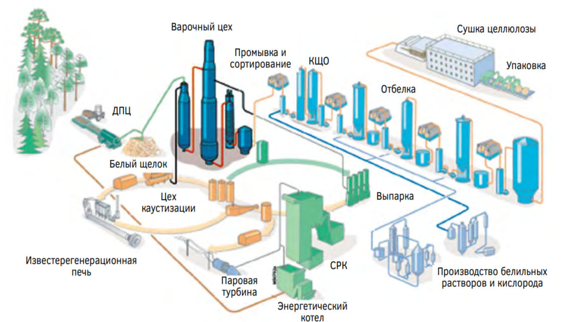 Цель — растворить инкрустирующие вещества древесины щепы (лигнин) в щелочном варочном растворе (смесь гидроксида натрия и сульфата натрия) и максимально сохранить целлюлозу и гемицеллюлозы, чтобы получить массу волокон с оптимальным содержанием остаточного лигнина для последующей менее затратной отбелки целлюлозы. Остаточный лигнин определяется показателем числа Каппа, в нашем случае для хвойной целлюлозы число Каппа 33. На рисунке ниже представлен цех для непрерывной варки целлюлозы по технологии COMPACT COOKING, представляющий систему двух сосудов. Первый сосуд — пропиточный бункер, второй — варочный котел. Щепу по транспортеру подают в пропиточный бункер. Цель пропитки — вытеснить воздух из щепы, чтобы обеспечить в процессе варки беспрепятственную диффузию варочного раствора в объеме щепки. Для пропитки щепы по центральной трубе бункера подают смесь охлажденного белого и черного щелока, который поступает из варочного котла. Пропитку осуществляют в мягких условиях при низкой темп