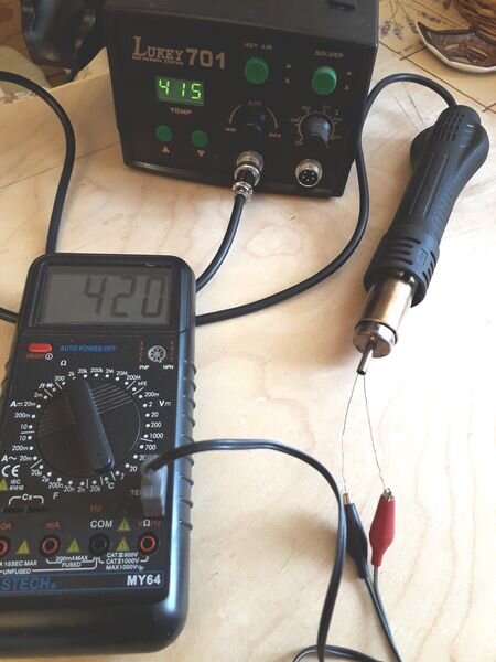 При измерениях температуры по нескольким разным точкам, отклонения от показаний индикатора на термофене, различались на плюс-минус несколько градусов. Фотография с другой температурой фена ещё есть в начале этой статьи.