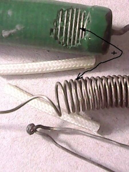 И так резисторы мы нашли, а что дальше? Дальше нужно аккуратно постукивая по резистору отбить у резистора эмаль, стараясь не повредить константановую проволоку и попытаться её отделить от резистора и смотать. Эту проволоку мы и будем использовать для изготовления термопар.