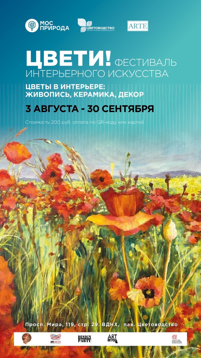 😍Мосприрода приглашает насладиться созерцанием произведений искусства и арт-объектами, объединёнными общей темой – цветы в интерьере. ✅ С 3 августа по 30 сентября в экоцентре «Цветоводство» Мосприроды на ВДНХ будет проходить фестиваль «ЦВЕТИ!», в рамках которого будут представлены произведения искусства и арт-объекты, объединённые общей темой – цветы в интерьере. На одной площадке соберутся архитекторы и дизайнеры, декораторы жилых помещений и общественных территорий, а также все любители изображений цветов в живописи. 🌼🌸🌼Цветы и картины с изображением растений, элементы декора с цветочным принтом всегда являются предметом восхищения, завораживающим и покоряющим с первого взгляда, а также представляют собой беспроигрышный элемент в интерьере и уместный подарок как для родных и близких, так и для коллег, гостей, руководителя, да и просто приятное приобретение для себя. 📝Программа фестиваля предусматривает как непосредственно выставку работ авторов, так и открытую мастерскую х