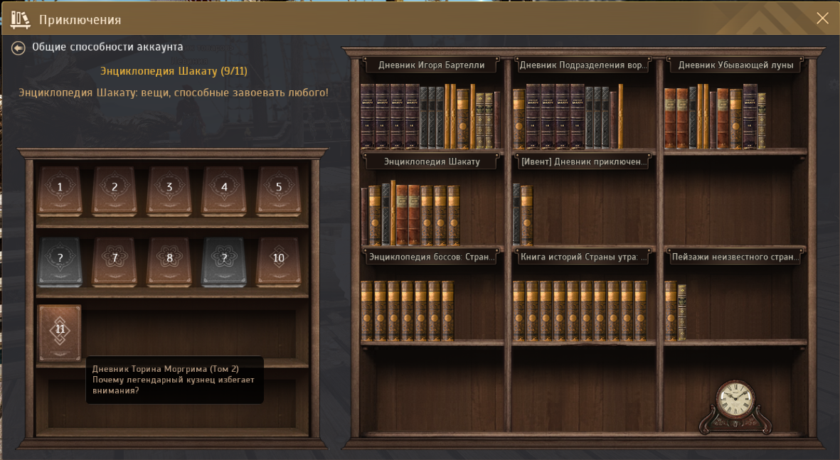 Дневник Торина Моргрима том 2 находится: Escape- Путешествие- Дневники приключений - Энциклопедия шакату. Номер 11. Задание 1. Отдать Торину Моргриму оружие босса +15. Выполнение: Точим самостоятельно на +15 или покупаем на аукционе готовое оружие Кзарки, Офина, Нубера или Кутума. Задание 2. Отдать Торину Моргриму броню босса с уровнем усиления I. Выполнение: Точим самостоятельно на I или покупаем готовое на аукционе и отдаем что-то одно из босс-сета (Нос, Древень, Бхег, Либр, Маскан, Аргон, Гиас, Грифон). Задание 3. Отдать Торину Моргриму оружие босса уровня усиления I. Выполнение: Покупаем на ауке или точим самостоятельно на I одно какое-нибудь оружие босса и отдаем. (Все так же, как в первом задании этого тома, только на один уровень выше(Кзарка, Нубер, Кутум, Офин)). Задание 4. Отдать Торину Моргриму броню босса уровня усиления II. Выполнение: Точим самостоятельно что-нибудь одно из босс-сета на II или покупаем на ауке готовое и отдаем. Все как в Задании 2 этого тома дневника, толь