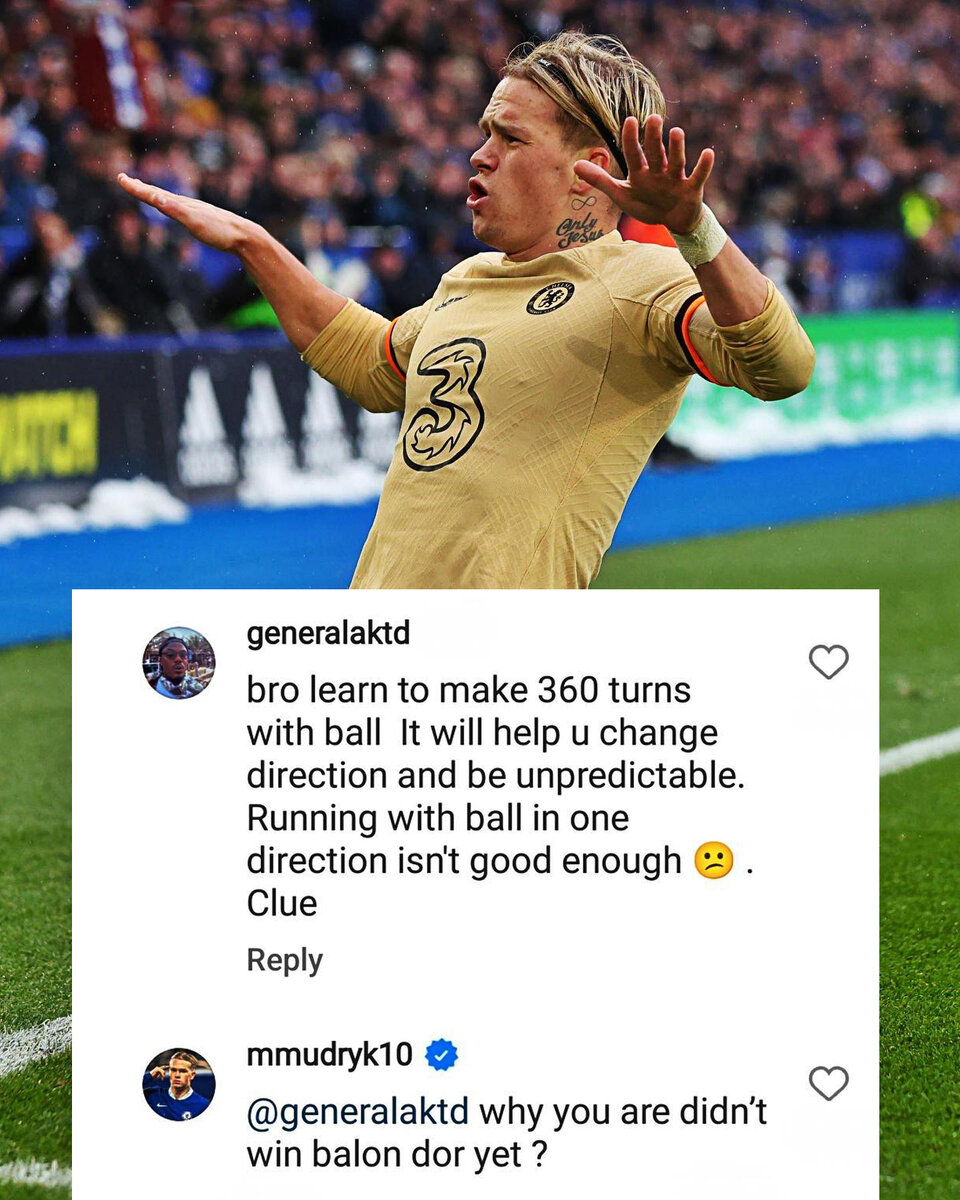 Его реакцию сложно объяснить. Украинский футболист «Челси» Михаил Мудрик ответил фанату, который раскритиковал его игру в соцсетях. 22-летний вингер перешел из «Шахтера» в «Челси» за 88 миллионов фунтов стерлингов в январское трансферное окно, но не забил ни одного гола и сделал всего две передачи в 17 матчах за новый клуб. Недавно Мудрик заметил в инстаграме пост фаната на себе, он написал, обращаясь к украинцу «Бро, научись делать разворот на 360 градусов, это поможет тебе менять направление и быть непредсказуемым. Бежать в одном направлении недостаточно». Похоже, звездный игрок «Челси» был не в настроении, поэтому решил лично ответить фанату. Он написал: «Почему ты до сих пор не выиграл «Золотой мяч»? Недавно Мудрик наконец забил первый гол за лондонский клуб, правда, пока только в товарищеском матче с «Брайтоном». Тем не менее, фанаты «Челси» оптимистично настроены на следующий сезон, глядя, как украинец взаимодействует с новичками клубам Кристофером Нкунку и Николасом Джексоном.