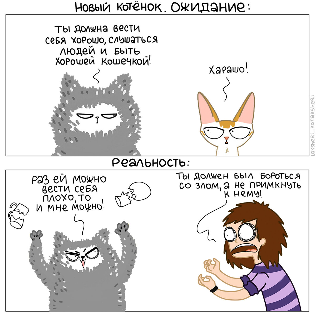 Вы не задумывались о том, что «хороший кот» — это кот, который удобен людям? 😅 А у котиков могут быть совсем другие интересы! Хотите воспитать кота? Делегируйте это на взрослого кота🤣 Так же можно поступить с кормёжкой) Будьте уверены: почти всегда плохое поведение котов спровоцировано вами) А если и нет, то всё равно да! Относитесь уважительно к котикам, но не ждите такого же отношения к вам) Изучите повадки котиков, чтобы знать, с чем вам придётся бороться: Знайте, рано или поздно вам придётся столкнуться с задачей, которую невозможно решить! Очень часто жизнь с котами будет требовать от вас креативных действий: В конце-концов, любые ваши попытки воспитать котов закончатся этим: Вы станете служить своему коту🤣 Согласны?