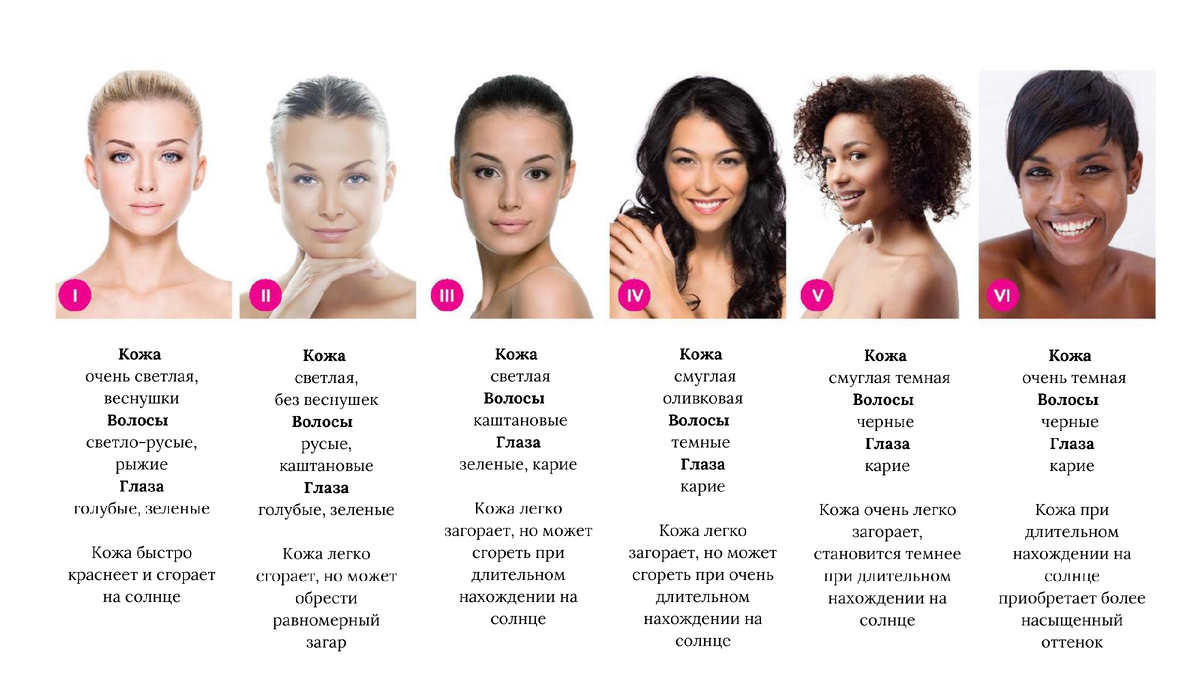 Существуют две основные характеристики, на которые стоит опираться, когда нужно выбрать солнцезащиту: 1. Ваш фототип 2. Уровень ультрафиолетового (УФ) индекса в конкретный день, когда вы собрались выйти на улицу. Фототип – это характеристика тона кожи, которая показывает чувствительность вашей кожи к ультрафиолетовому излучению. ⠀ Всего по Фитцпатрику выделяют 6 фототипов + 1 нулевой, официально не выделяемый. Именно по ним можно ориентироваться в повседневной жизни при отсутствии других солнцечувствительных заболеваний. УФ-индекс вы можете смотреть ежедневно в приложении погоды, или поставить напоминашку о нём на смарт-часы. Так можно определить необходимость и степень солнцезащитных мер вне зависимости от времени года и местоположения. Принцип определения такой:
