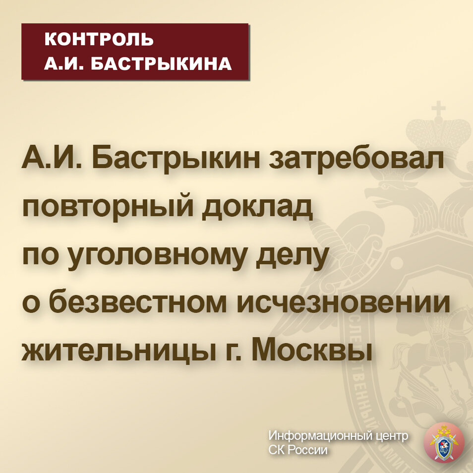 А.И. Бастрыкин затребовал повторный доклад по уголовному делу о безвестном исчезновении жительницы г. Москвы