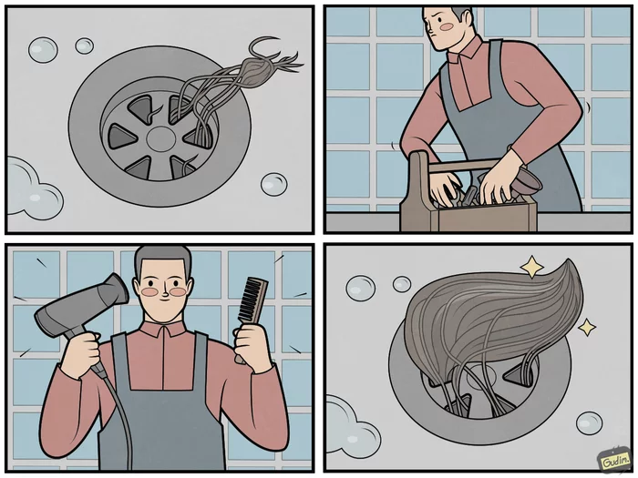 Какое место в доме можно считать самым удачным для основы комикса? Думаю это ванная комната. Именно в ней происходит большинство забавных и нелепых событий, на основе которых можно сделать удачный комикс. Этим пользуется немало художников и комиксов про душ и ванну выходит огромное множество. При этом сюжеты довольно разнообразные. Одни художники показывают ванную комнату как место для релаксации и размышлений, а другие как место где их постоянно поджидают досадные неприятности. Давайте пробежимся по страницам художников и посмотрим, кто что нарисовал на эту тему. Начнем с одного из самых популярных российских художников Антона Гудима. Вмдимо у его девушки длинные волосы и он не понаслышке знает, чем это чревато для труб. А творческая фантазия подсказала комиксисту, что можно сделать с волосами. А это новый комикс от Арт-студия Дардекилио, его автор Анна создала антропоморфного персонажа Алису. Алиса конечно милашка, но ужасная недотепа и не умеет даже спокойно сходить в душ. Это нова