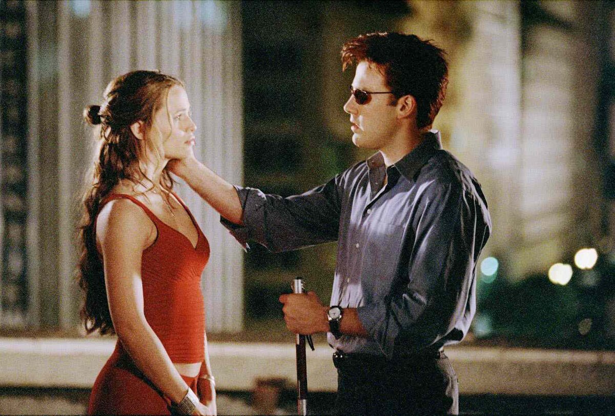 После успеха «Человека-паука» Сэма Рэйми мир был готов к еще одному супергеройскому фильму, и Марк Стивен Джонсон впрыгнул в этот поезд. Бену Аффлеку досталась роль слепого борца за справедливость, но его игра оказалась настолько тусклой, что подвела весь фильм. Аффлек и сам соглашается с этим, в недавнем интервью он признался, что жалеет об участии в этой картине. Но несмотря на провальную игру актера, сюжет у ленты достаточно хорош, чтобы ее посмотреть.