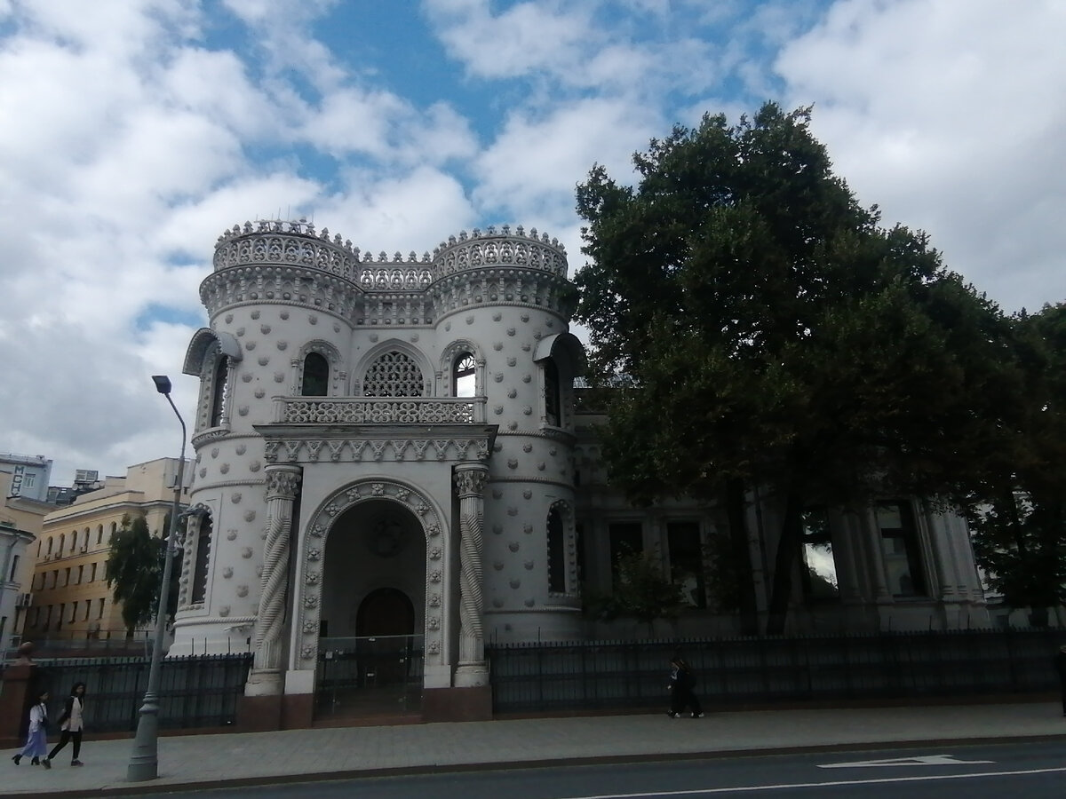 Рядом со станцией метро Арбатская есть дом, который выделяется даже на фоне московского разнообразия архитектуры. Этот дом в совершенно не московском стиле, построил купец Арсений Морозов. Точнее сказать это скорее был "мажер" племянник Саввы Морозова имеющий родственные связи сразу со многими купеческими фамилиями. Есть сплетня, что сейчас в этом доме официальная резиденция самого высокопоставленного пенсионера страны. Думаю, что это маловероятно. Во первых сильно уж это смешно, что более похоже на журналистские сочинения. Да и вряд ли этот высокопоставленный человек часто там бывает. Не то впечатление он производит. Могу сказать, что это красивый дом. Не даром его использовали как место приёмов во времена председательства России в большой восьмёрке. Сейчас это даже звучит странно. Кроме того, именно в этом месте проходила часть событий последнего романа Акунина про Эраста Фандорина "Не прощаюсь", где повествование касалась анархистов в Москве. Для меня это тоже интересно. Вот