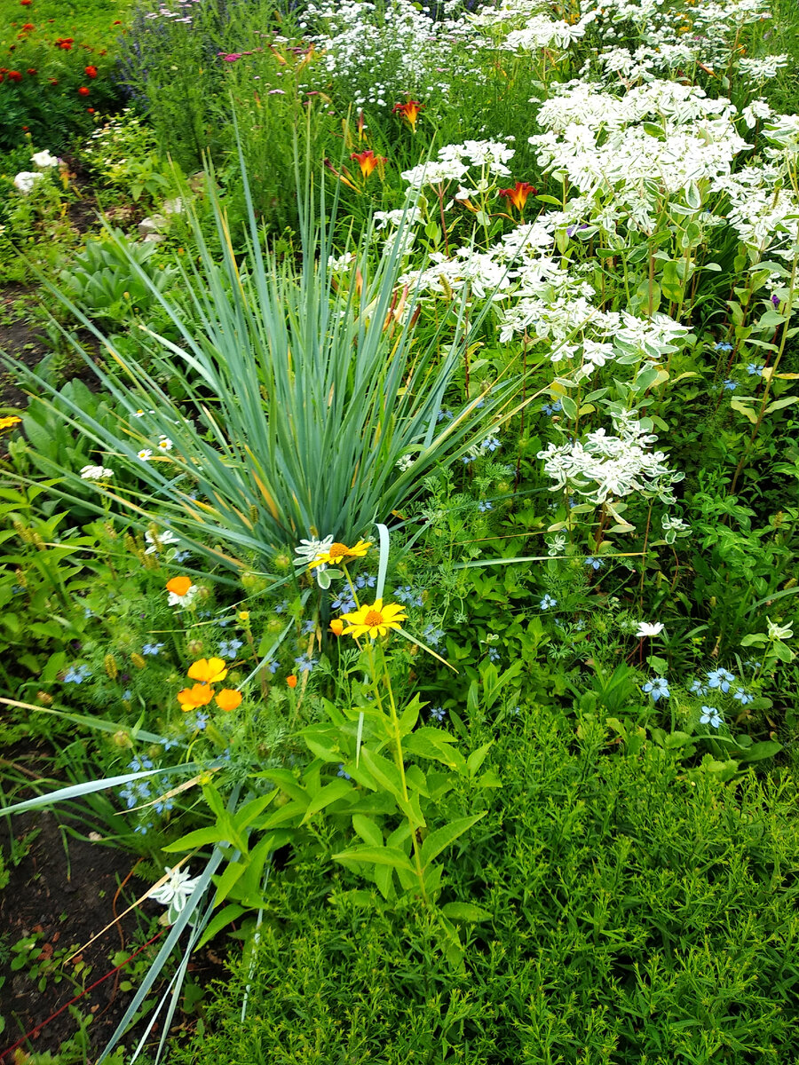 Доброго времени суток, дорогие мои друзья ! Мои постоянные читатели знают, что в цветнике у дороги многие растения у меня растут самосевом. На первом фото посажен колосняк и лилейники. Гипсофила, знаюпросто бросила остатки семян, вот такое сочетание воздушной гипсофилы и одинокого цветка нигелы Гелиопсис растет целыми зарослями. Вот такой колокольчик, это новый житель, подарок от подписчици, говорят разрастается сильно, а я не против. Иссоп тоже как сорняк и когда он успевает насееться, вроде бы срезаю во время. Сальвия хорминумовая, тоже самосев, если в большом цветнике только синяя, то здесь разная. Тут какая то астра растет высокая и тысячелистники, наконец то. Лук, по моему слизун, ещё тот агрессор. Кореопсис, молочай, тоже самосев Бархатцы сею каждый год, как же без них Молочая просто поля. И лилии тоже сами распространяются. Здесь есть октябринки высокие и низкие, но они свою красоту покажут осенью. Всём мира, добра, здоровья! Ваша Надюша и мой деревенский сад!