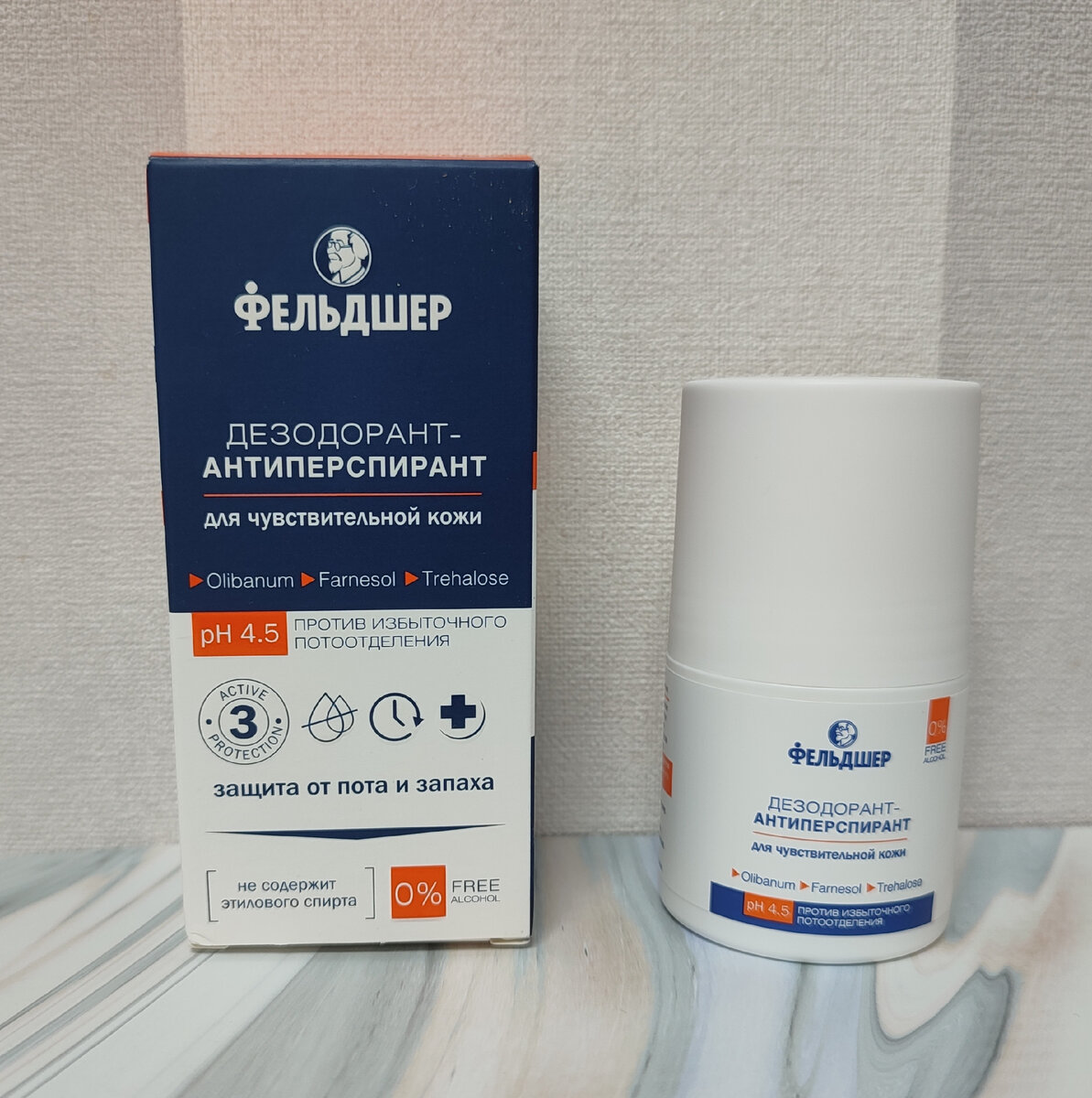 Я думаю, что многие сталкивались с проблемой избыточного потоотделения и неприятного запаха. Перепробовав много различных дезодорантов, я решила приобрести дезодорант-антиперспирант от Фельдшер. В состав средства входят компоненты, предназначенные для ухода за чувствительной кожей. Они образуют защитный слой, который помогает сохранить кожу сухой и предотвращает ее раздражение. Средство также способствует восстановлению кожи после бритья и не содержит этиловый спирт, что позволяет сохранить естественный уровень влаги в коже. Содержит комбинацию из активных компонентов "3 active protection" (Olibanum, Farnesol, Trehasole), которые надёжно защищают от избыточного потоотделения и неприятного сахара. Также в составе ещё и экстракт зелёного чая. Дезодорант-антиперспирант приходит в коробке бело-синего-оранжевого цвета. Внутри находится флакон, который имеет форму цилиндр. Крышка удобная, не скользит в мокрых руках, удобно закручивается и откручивается. Дозатор в виде шарика, им очень удобн