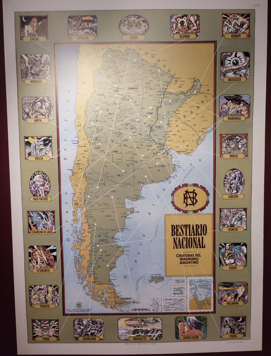 Не секрет, что коренные народы Южной Америки расширяли сознание природными психоделиками. Это породило целый сонм удивительных и жутких монстров, о которых рассказывается на выставке "Бестиарий" в Центральной Библиотеке Аргентины - довольно монструозном, кстати, здании в стиле брутализма. Здесь даже создали карту их обитания. Самые страшные, кстати, живут на границе с Чили. Женщина по имени Сапам-Сукум с огромной грудью, которая при ходьбе издает соответствующие звуки. Выкармливает голодных младенцев и ворует сыновей лесорубов, чтобы те, когда вырастут, не вырубали заросли рожковых деревьев. Иногда развлекается тем, что в процессе любовных утех душит грудью мужчин - таким образом мстит за нанесенные ей в молодости травмы. Лечуга - птица, которая приносит дурные вести. В прошлом была швеей. Сшила красивое платье, и чтобы выделиться на народном гулянии, весь вечер танцевала в нем, бросив своих семерых детей. Когда праздник закончился, выяснилось, что ее дети умерли от холода. От гор