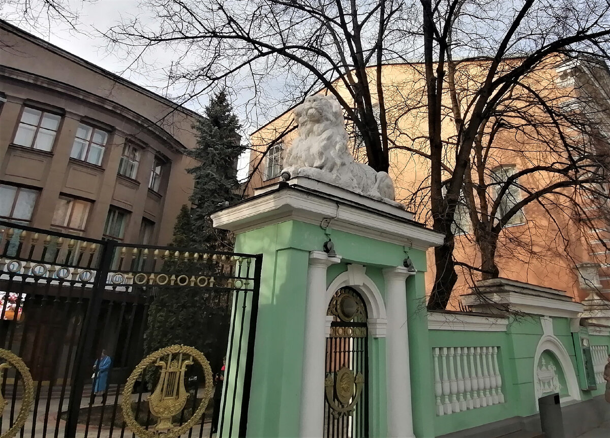 То есть именного с того момента, когда в 30-х годах прошлого века, следуя рецепту братьев Весниных, к старинному классическому особняку приделали конструктивистский шедевр - как будто специально в пику старому миру выстроили этот серый промышленного вида корпус. Получился типичный образец московской эклектики: из-за неоклассических ворот со львами выглядывает эдакий вариант заводоуправления.