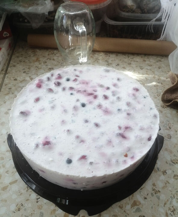 Распустить желатин в молоке. Творог смешать со сметаной, добавить ягоды, сахарозаменитель, и влить молоко с желатином. Ещё раз хорошо размешать и вылить творожную смесь на корж. Корж должен быть хорошо о