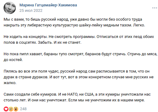 Война – как волна, как цунами, смыла всё зыбкое, сомнительное, праздношатающееся, ничтожное, бессмысленное. Смылись, спасая свои кошельки, деятели русофобствующей культурки. «Где сокровище ваше, там будет и сердце». Если их сокровище за бугром, русским духом от них и не пахнет. Нет у них причастности, привязки к народу, к Родине, нет совести, сострадания, простых и естественных человеческих чувств. Лишь ненависть, злоба, агрессия. Смылись и вымарали свой человеческий облик. Продали, предали в первую очередь самих себя – свою историю, судьбу, культуру, свой род. Что может быть страшнее участи предателя? Им везде – чужбина ядовитая. Их удел – скитание в муках, неприкаянность, отверженность, беспокойство, описанные во многих великих книгах, подтвержденные историческими фактами. Самый известный пример: не в силах терпеть страдания после совершенного предательства, Иуда накладывает на себя руки. Некоторые ученые видят в этом поступке слабость, а некоторые - своеобразное признание своей ви
