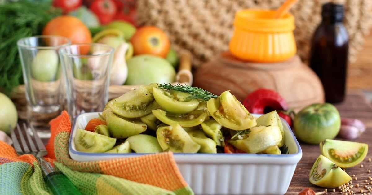 1. Пикантная закуска на зиму "Маринованные зеленые помидорки с орехами"