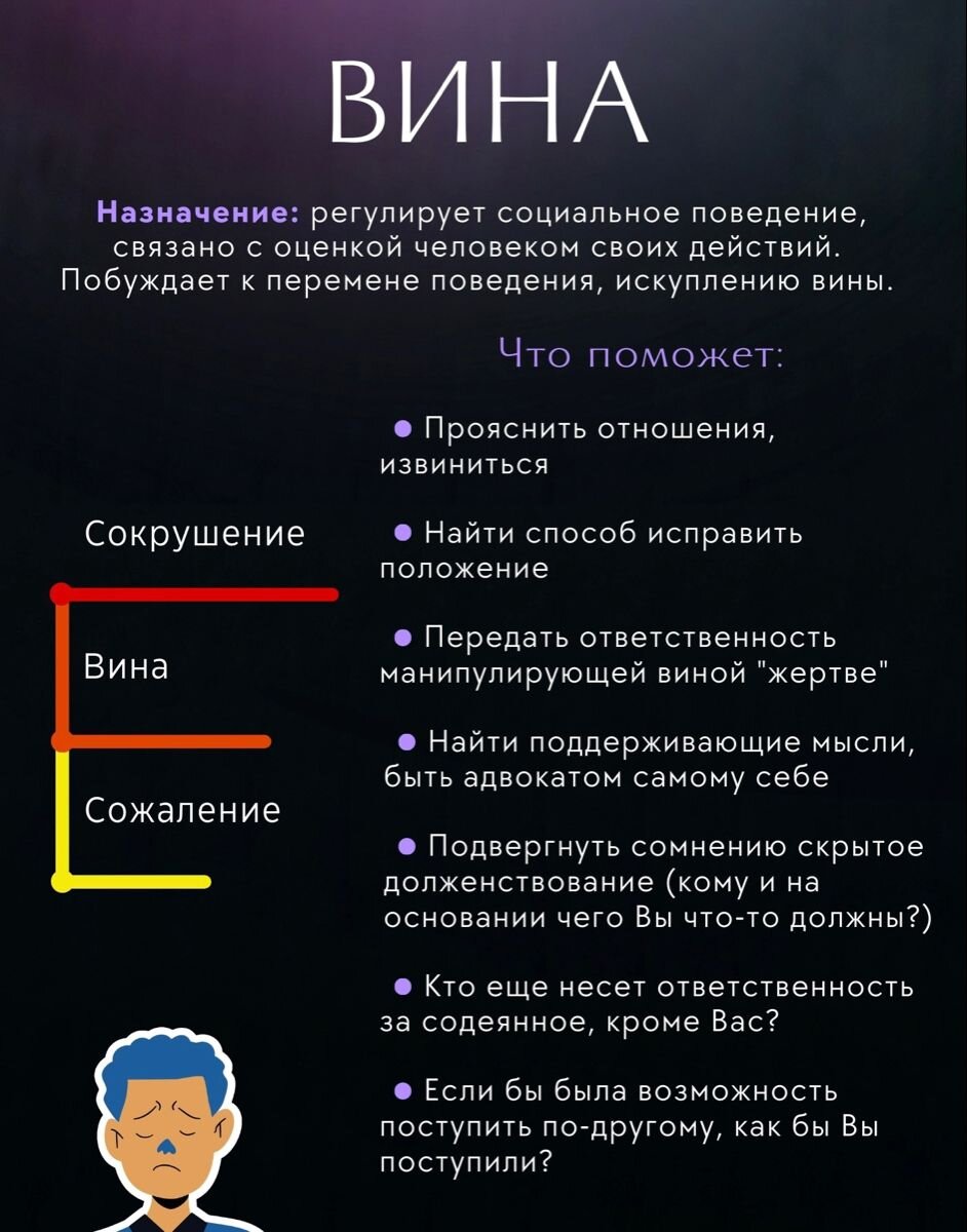 Чувство вины помогает понять, что человек сбился с пути, предал себя и/или свои принципы. Вина подсказывает, что нужно быть более внимательным к себе и к окружающим. Это своеобразный компас, который указывает живем ли мы в контакте со своими ценностями, с окружающим миром. Еще вина помогает наладить отношения с людьми после совершенных ошибок. Это полезная функция вины.