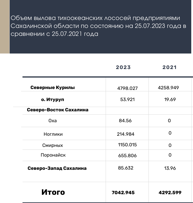 На 25 июля 2023 года вылов тихоокеанских лососей предприятий Сахалинской области составил 7 043 тн. В том числе горбуши 5 407 тн., кеты 1 032 тн., нерки 555 тн., кижуча 48тн.