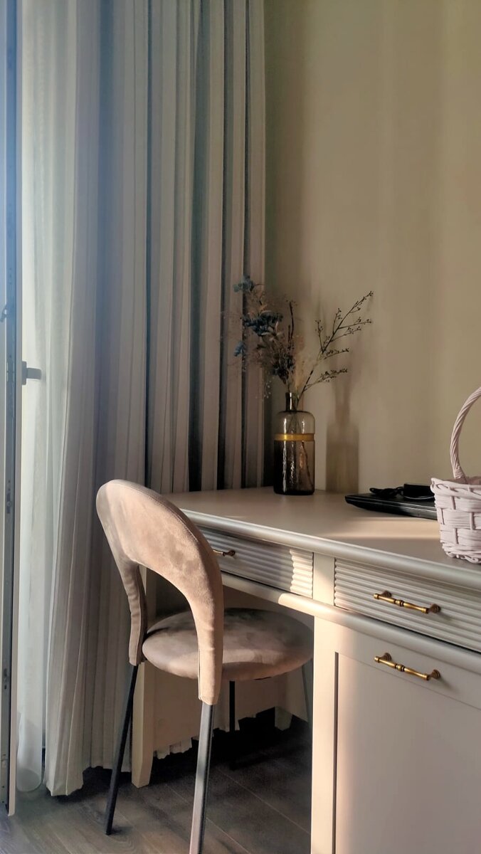 В данном случае пропускающие свет портьеры посажены на подкладку. Это решение даёт ощущение лёгкости лицевой части портьер, и вместе с тем не даёт свету пройти через шторы.