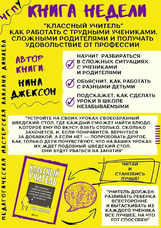 Снова новая неделя - снова новая книжная рекомендация от педагогический мастерской Алихана Динаева! Как и обещали, делимся с вами нашей яркой инфографикой. Если ваш ответ - «ДА», то Нина Джексон (автор книги) придёт вам на помощь ! «Увлечь учебой — значит предоставить ученикам возможность дерзать и творить. Нужно поднять их уровень адреналина, заинтересовать отдельными предметами и обучением в целом, зажечь их — и тогда дела пойдут на лад. Страсть к учебе похожа на зависимость: чем больше нравится, тем больше хочется — как сладкоежке в кондитерской» - Нина Джексон. Вот и подумайте: