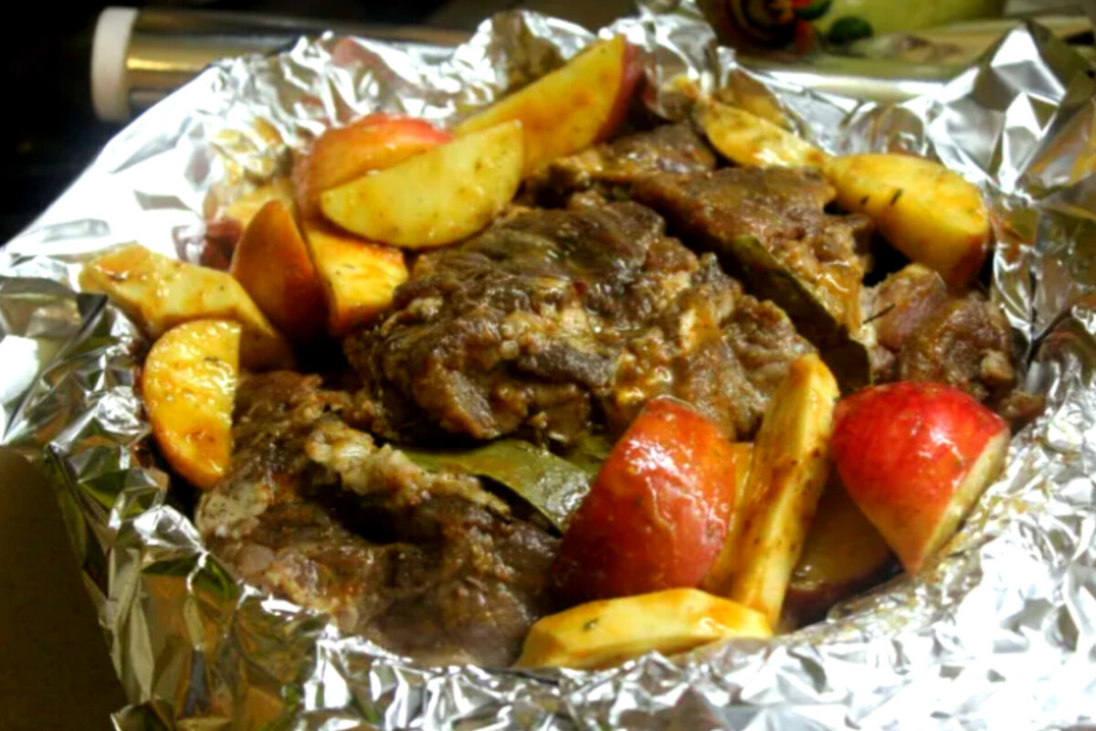 Ингредиенты: 1. Свинина 800 грамм 2. Мелкие яблоки 3 штуки 3. Горчица и молотый перец по вкусу 4. Соевый соус 2 столовые ложки 5. Любая зелень для украшения блюда. Начинаем готовить. Мясо нужно промыть и высушить бумажным полотенцем. Далее приступаем к мариновке. Смешиваем соус, молотый перец и горчицу. Натираем этим маринадом нашу свинину. Оставляем пропитаться на пол часика. Для запекания лучше использовать фольгу, что бы сок с мяса не вытекал, а оставался в мясе для его сочности. Растилаем фольгу на протвень, кладем мясо и обкладываем мясо яблоками, предварительно порезав их на дольки. Желательно очистить яблоки от кожуры. Заматываем плотно мясо в фольгу и отправляем в духовку на 40-50 минут при 150-180 градусах. При подаче на стол можно украсить блюдо зеленью. Всем приятного аппетита.