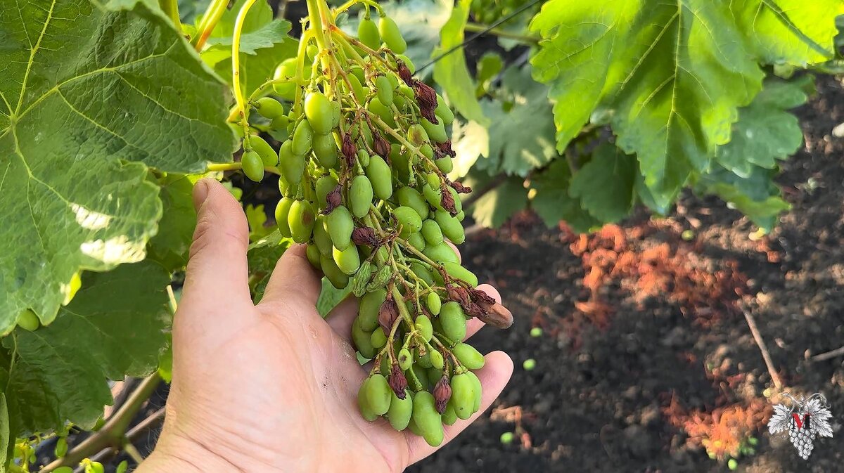 В данном выпуске я расскажу Вам о солнечном ожоге ягод винограда. А также я расскажу Вам о том, как защитить ягоды винограда от солнечного ожога винограда. В настоящий момент температура бьёт все рекорды – за последние три дня температура воздуха доходила до +40 градусов по Цельсию. Именно в такое время виноград больше всего подвержен такому явлению, как солнечный ожог ягод. Многие начинающие виноградари, видя на своих ягодах винограда пятна (и вдавленные пятна – смотрите на фото ниже), сморщенные и усыхающие ягоды начинают паниковать, берут химию и заливают ею свой виноградник. Особенно усердно такие виноградари работают по гроздям и зачастую применяют такой препарат, как "Свитч" (этот препарат хорошо работает от гнилей). Это происходит из-за того, что начинающие виноградари путают солнечный ожог винограда с серой гнилью. Соответственно виноград обрабатывают, а результата никакого не получают. Выше и ниже на фотографиях Вы можете видеть именно солнечный ожог винограда, а не серую гнил