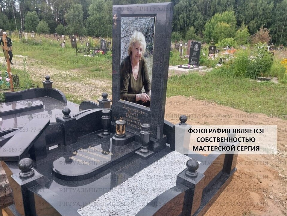 Гранитный комплекс из гранита Габбро Диабаз(Карелия) на бетонной заливке на сваях, с помощью которых фундамент становится независимым от подзахоронений или подкопов соседних оград либо внутри ограды. Прямоугольный красивый памятник с фасками сверху и по бокам, превосходное качество, полированный со всех сторон, данный памятник был подобран под портрет 1,2х60 с полированным фальцетом, из-за конфиденциальности фото было заменено. Отличный вариант для одиночного захоронения. Сзади стелы - художественное оформление в виде иконы, которая тоже вмонтирована вглубь и ниже расположена небольшая молитва.