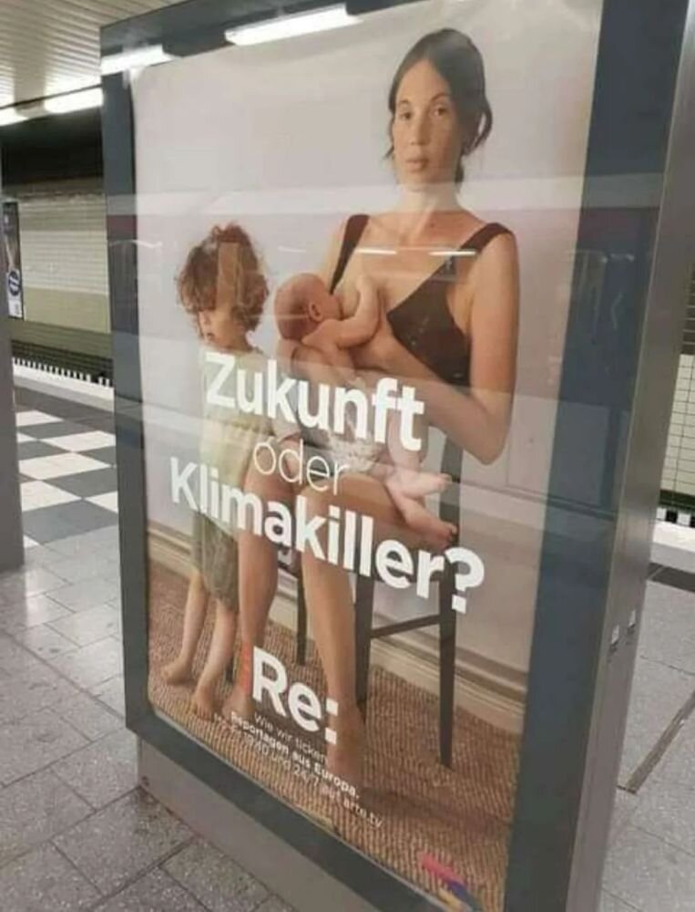 Речь идёт о серии репортажей канала arte «Re:». Затрагиваются многие темы. На плакате одна из них. Женщины-активистки Friday for future, считают безответственным рожать детей в мир, в котором нарушен экологический баланс.