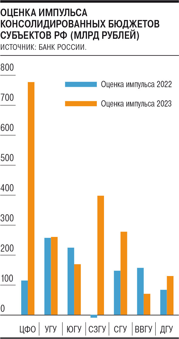 Согласно бюджетным планам, наибольшим рост импульса будет в Центральном и Северо-Западном макрорегионах, наименьшим — в Поволжье (см. график). «Величина бюджетного импульса в целом по России может сложиться выше, чем в 2022 году, и ближе к уровню 2020 года. Это поддержит инвестиционный и потребительский спрос в экономике, позитивно влияя на выпуск и выступая в качестве фактора роста цен на товары и услуги»,— сказано в обзоре регулятора.