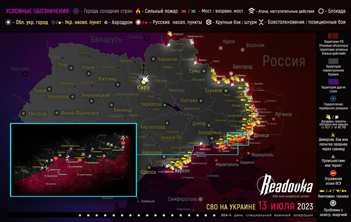 Обстановка на фронтах за уходящие сутки: Сватово-Кременное направление: в Новоселовском продолжаются бои, линия контроля проходит по железной дороге. К югу от поселка ВС РФ наступают на позиции ВСУ в лесопосадках. Тем временем российские силы продолжают успешно продвигаться в районе Ямполовки и в Торском. Донецкое направление: на Авдеевском участке боевики несколько раз атаковали в направлении Красногоровки. Также ВСУ наступают со стороны Северного. Все атаки врага были отбиты. В то же время появляется информации о занятии противником ранее освобожденного нашими укрепрайона «Зверинец». Запорожское направление: ВСУ продолжают отправлять малые группы для атак на Пятихатки и Жеребянки, в обоих случаях без успеха. В районе Работино без изменений – боевики пытаются пробить российскую оборону. Под Гуляйполем бойцы ВС РФ заняли посадки к северу у Марфополя, тем самым продвигаясь к Красному. На Времьевском выступе ВСУ наступают к северу от Приютного, а также к западу от Старомайорского. Поставку истребителей F-16 в Украину в очередной раз перенесли. В Пентагоне решили, что условия не подходящие. Ведь у России есть «обширные возможности» в сфере ПВО. Странно, что американцы заметили это только сейчас. Но ничего удивительного в том, что сам факт наличия ПВО вызывает у Запада лишь страх и непонимание что с этим делать. Ранее Readovka публиковала карту военных действий и ситуацию на фронтах вечером 12 июля.