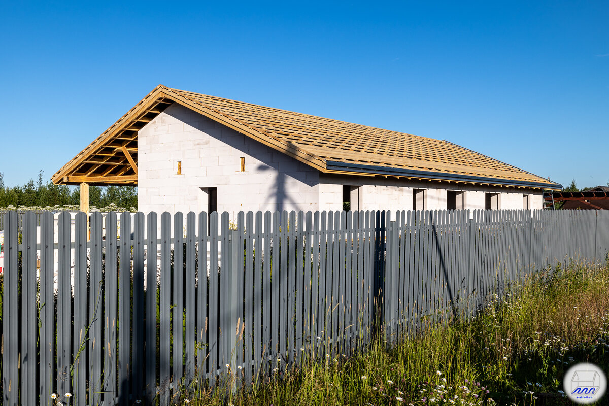 Наша текущая стройка идёт в Осельках (Всеволожский район Ленинградской области), строим одноэтажный дом из газобетона площадью 108,5 м2: Площадь указана по внешним габаритам, размеры дома 6,7*16,2 м + терраса на сваях шириной 3 метра, ещё 48,5 м2: На момент съёмки всё готово к монтажу кровельного покрытия (в данном случае это будет модульная металлочерепица Гетеборг от Aquasystem), сделана обрешётка кровли, смонтирован брусок контробрешётки и подкровельная мембрана. Угол крыши 23°: Пару недель назад готовы были только стены и перегородки, тогда дом смотрелся так: Фундамент УШП, кстати, мы строили ещё в 2022 году, ровно год назад, тоже в июле. Вид с того же самого ракурса: В центре дома будет кухня-гостиная площадью 32,5 м2 с высоким потолком по стропилам, в остальных помещениях потолки обычные 2,75 м. Будущая кухня-гостиная ещё без кровли: И она же уже почти под крышей: Конструкция стропильной системы в разрезе с основными размерами: Общая 3D модель перекрытия: Терраса под общей с до