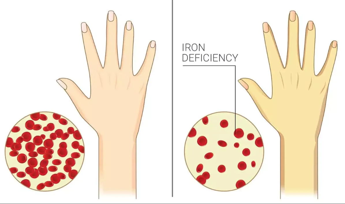 Без него невозможна выработка гемоглобина, а значит, все ткани и органы страдают из-за кислородного голодания. Без лечения это приводит к развитию анемического синдрома. Он проявляется бледностью, слабостью и постоянной усталостью, головокружениями и частой головной болью. Перебои в работе сердца, зябкость рук и ног, сухость кожи и ломкие волосы и ногти — частые симптомы анемии.